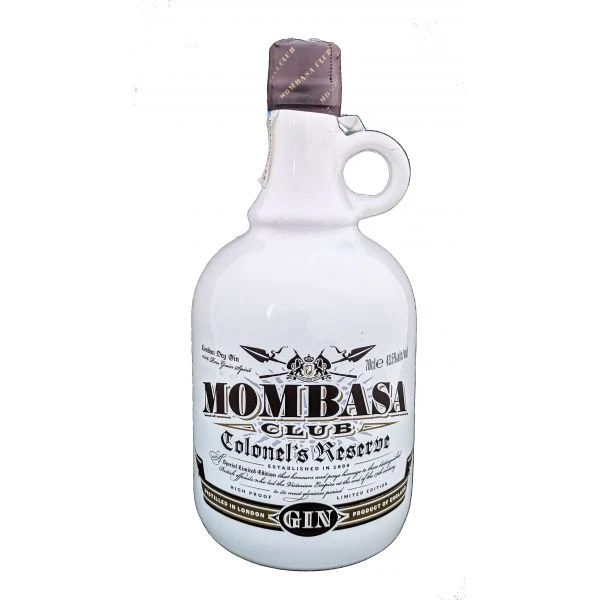La botella de la Mombasa Colonel’s Reserve es elegante y sofisticada, con un diseño que evoca la época de la colonización británica en África. La etiqueta presenta un retrato del coronel W. J. Baxter, un oficial británico que luchó en la Primera Guerra Mundial y que fue el fundador de la destilería que produce esta ginebra.